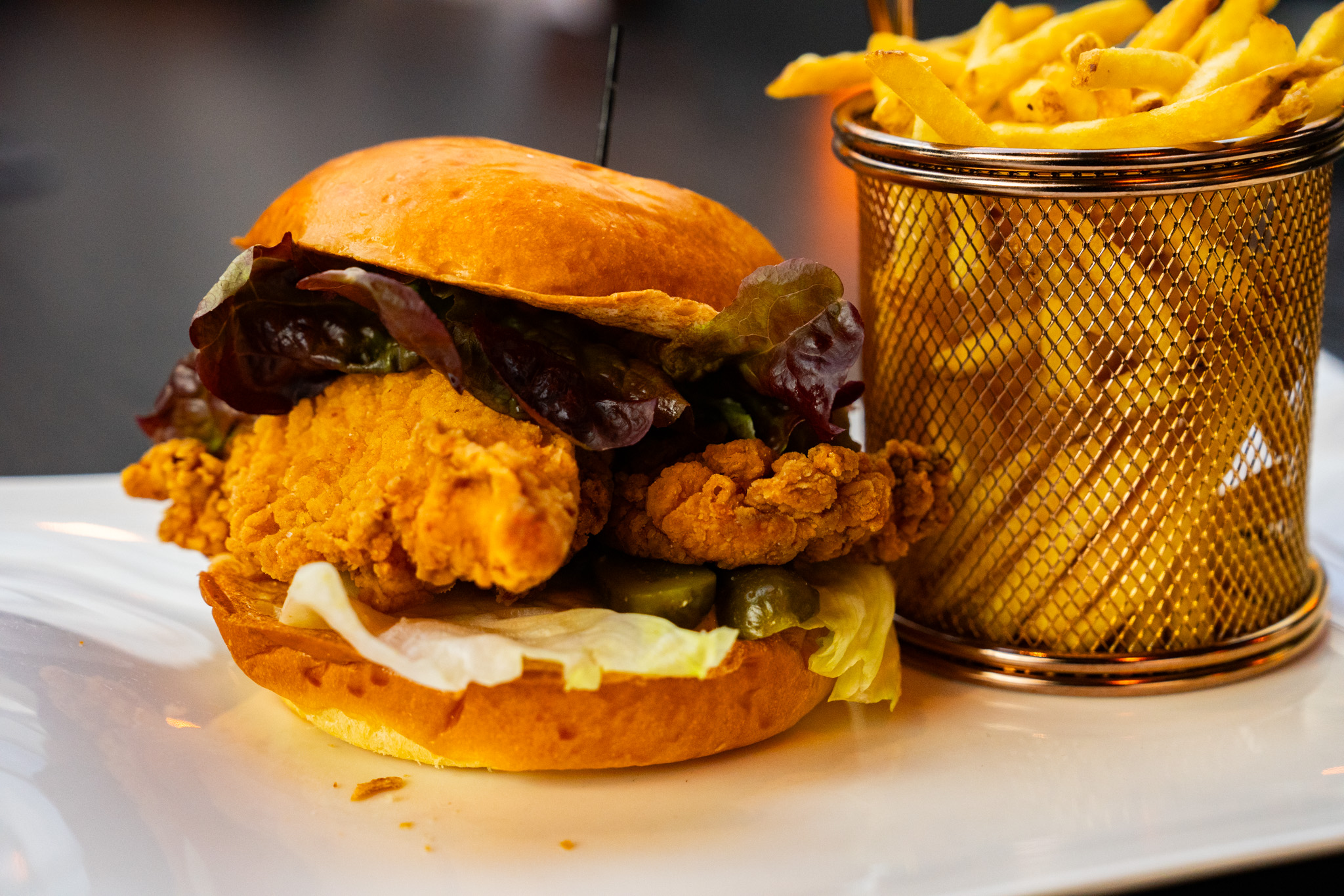 Potato bun, fried chicken, sriracha mayonnaise, pickles, salad, caramelised onions