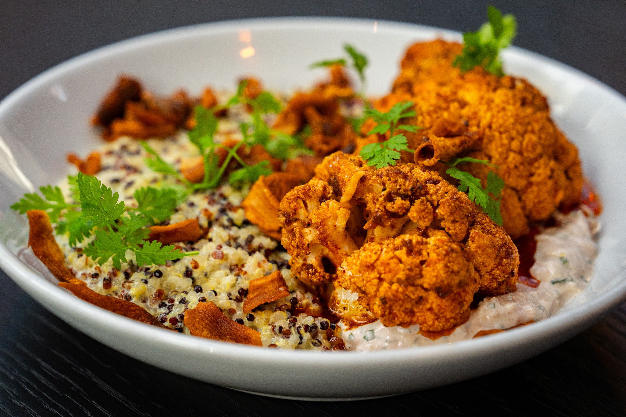 Quinoa risotto, roasted cauliflower with soft spices, raita sauce, jerusalem artichoke crisps